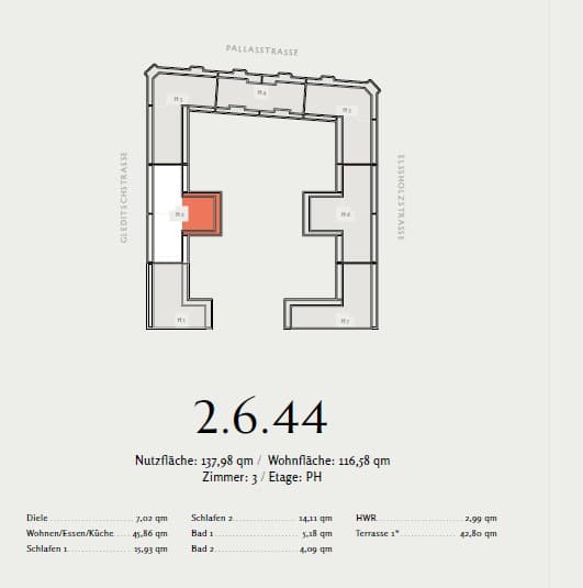 Этот совершенно новый комплекс элитной недвижимости «Am Winterfeldt» выгодно отличается исключительным расположением в центральном районе Шенеберга. Он расположен в самом популярном районе Западного Берлина, известном своими многочисленными кафе, ресторанами, бутиками и еженедельными рынками. Район посольств, всемирно известный роскошный универмаг KaDeWe и улица Курфюрстендамм находятся в нескольких минутах ходьбы. Район предлагает богатую культурную жизнь с известными художественными галереями, музеями и концертными залами, такими как Берлинская филармония и новая Национальная галерея. Он также окружен множеством зеленых зон и парков, таких как Парк Генриха фон Клейста, Виктория-Луизе-Плац и Парк-ам-Гляйсдрайк. Район предлагает отличное транспортное сообщение с несколькими линиями метро (U1, U2, U3, U4 и U7). Это позволяет легко добраться до городских достопримечательностей, таких как Александерплац, Потсдамская площадь или Зоологический сад.